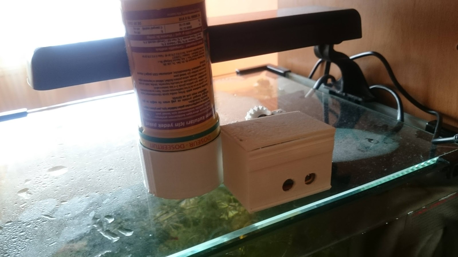 Poziționarea dispozitivului pe capacul acvariului.Toate componentele pe care le-am printat le-am conceput in Tinkercad și le găsiți aici.