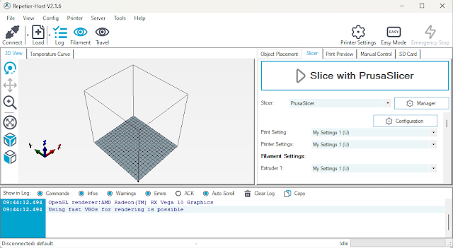 6. Open aplicația de interfață pentru imprimare . Eu folosesc RepetierHost https://www.repetier.com/, care îmi permite sa configurez mai multe "Slicere".